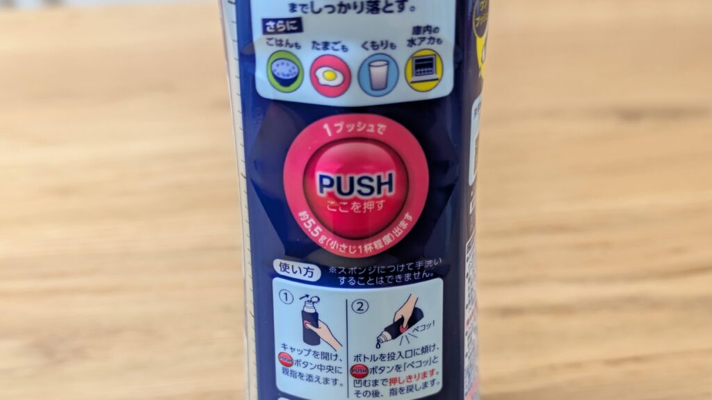 画像の『PUSH』部分を押すだけで簡単に洗剤を投入できます。