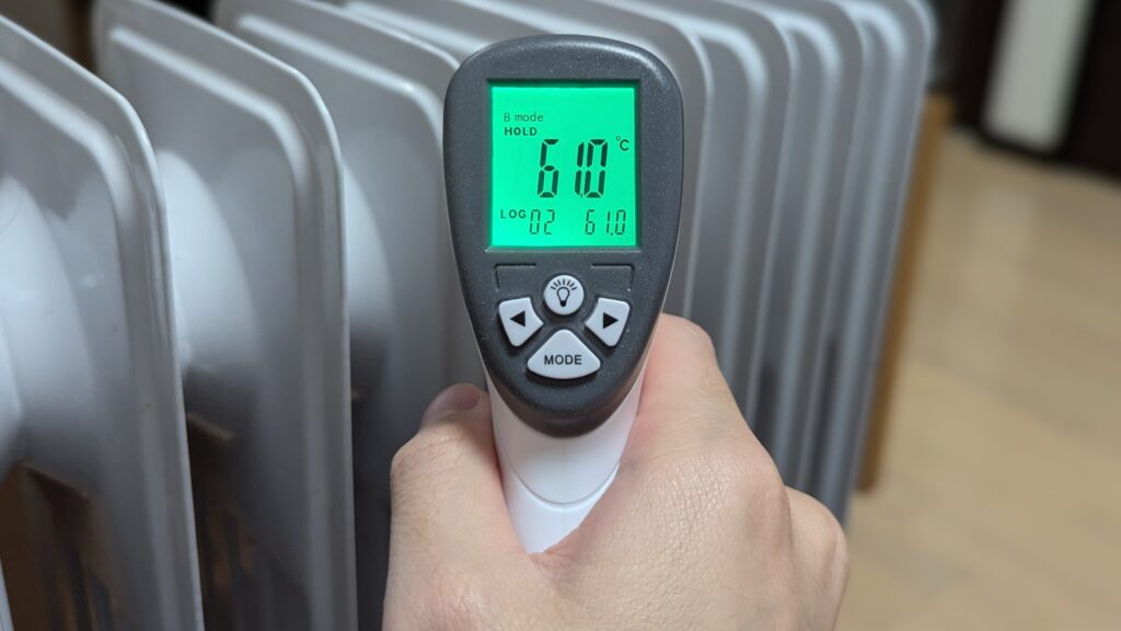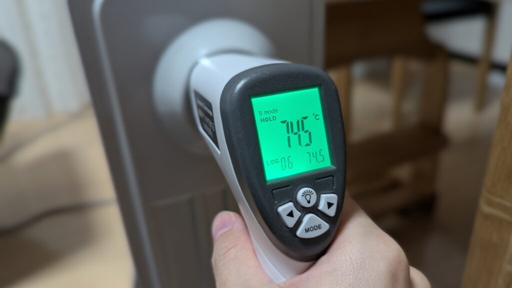 オイルヒーターが1500Wでフル稼働している状態で表面温度を非接触温度計で測定してみました。
