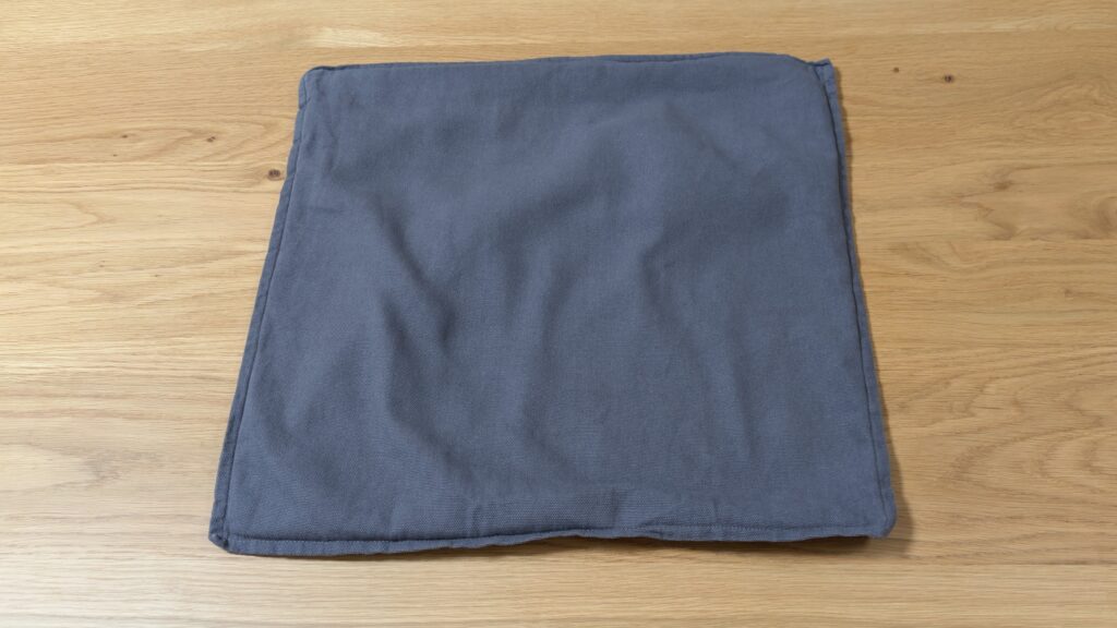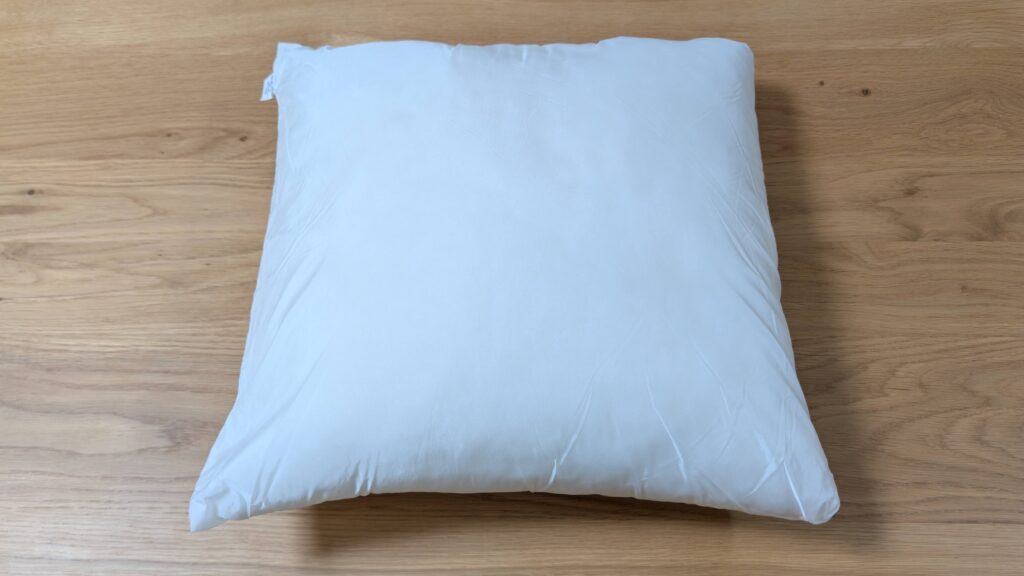 クッションカバーの大きさは 43×43cm で、今回紹介しているクッションの大きさは 45×45cm なので、クッションカバーの方が縦横2cmずつ小さいです。